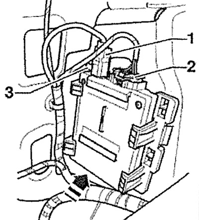 Приёмник радиосигнала дополнительного отопителя «R149» находится за левой боковой облицовкой багажного отсека. Снять левую облицовку багажного отсека. Отсоединить антенный разъём «1» и разъём «2». Нажать язычок фиксатора «3» и вытолкнуть приёмник радиосигнала из кронштейна «стрелка».