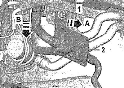 Выключить зажигание и все электрические потребители. Снять передний правый подкрылок. Отвернуть гайку «1». Вытянуть выпуск «2» «стрелка А» и извлечь его из отопителя «стрелка В».