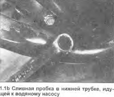 1. Херметически затворена охладителна система (налягане над атмосферното) включва центробежна водна помпа; алуминиев радиатор с кръстосан поток (оборудвани с пластмасови странични резервоари); прозрачен разширителен съд, монтиран на вътрешния панел на лявото крило; електрически вентилатор с контролирана температура, монтиран на гърба на радиатора; термостат, както и свързващи тръби и маркучи. Дренажната пробка на охладителната система се намира в долната тръба (виж снимката). Има друга пробка за източване - в цилиндровия блок, близо до корпуса на съединителя от страната на горивната помпа.